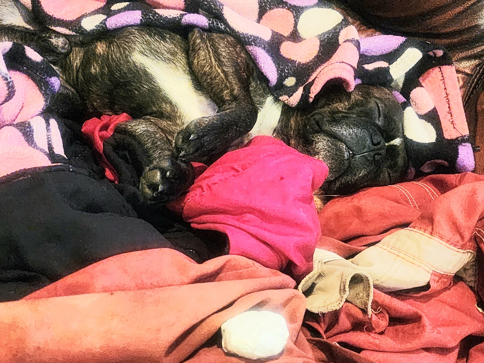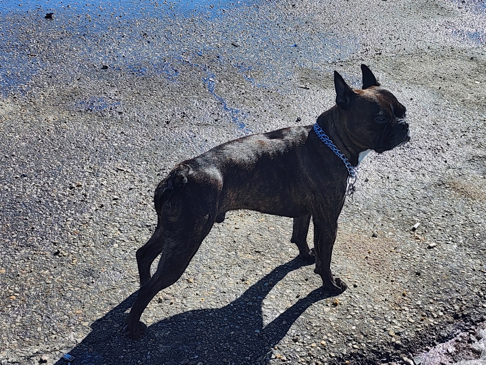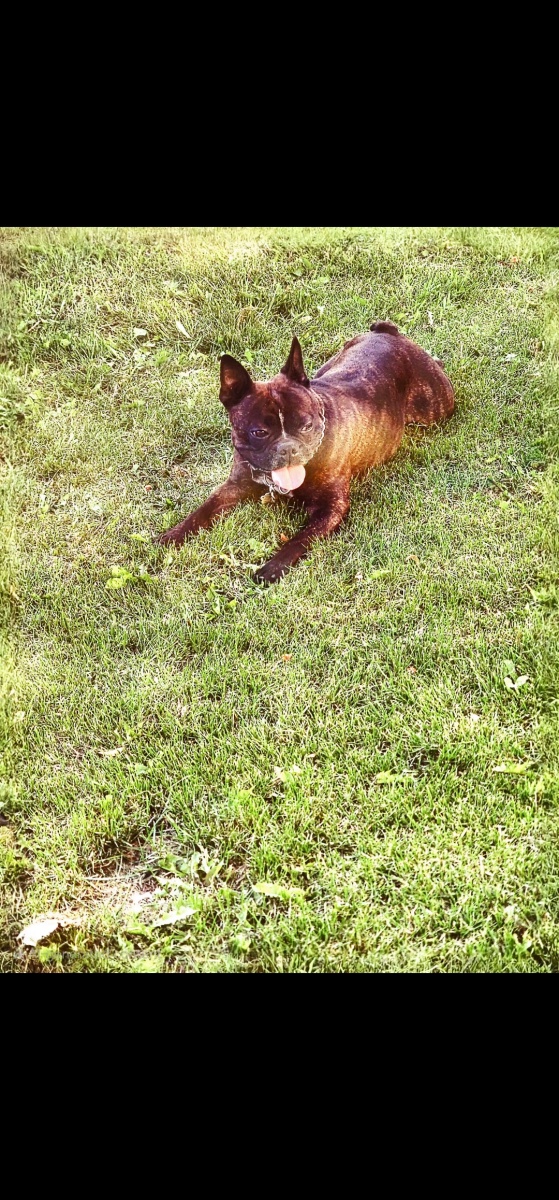 DARK BROWN BRINDLE, WHITE SPOT ON UPPER CHEST, WHITE MARK ON FORHEAD BETWEEN EYES , FRENCHTON , SILVER CHAIN, VERY FRIENDLY, EMOTIONAL ANXIETY SUPPORT DOG ,